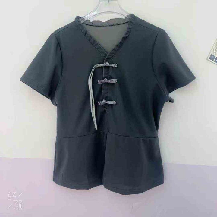 夏季时尚休闲显瘦套装女国风盘扣短袖上衣微喇叭裤两件...