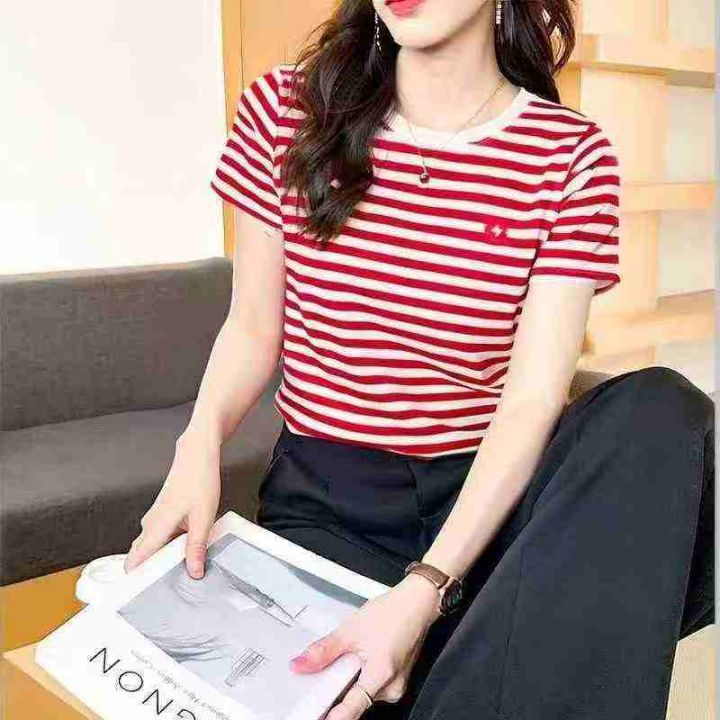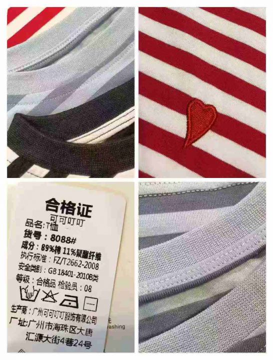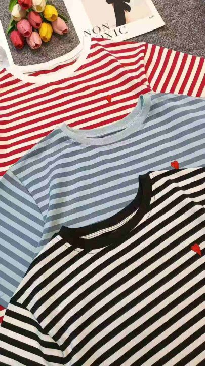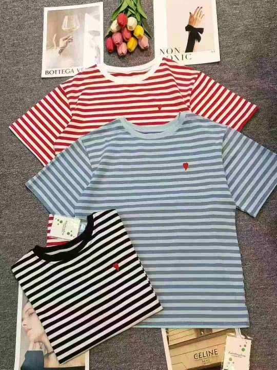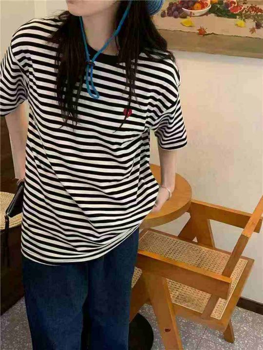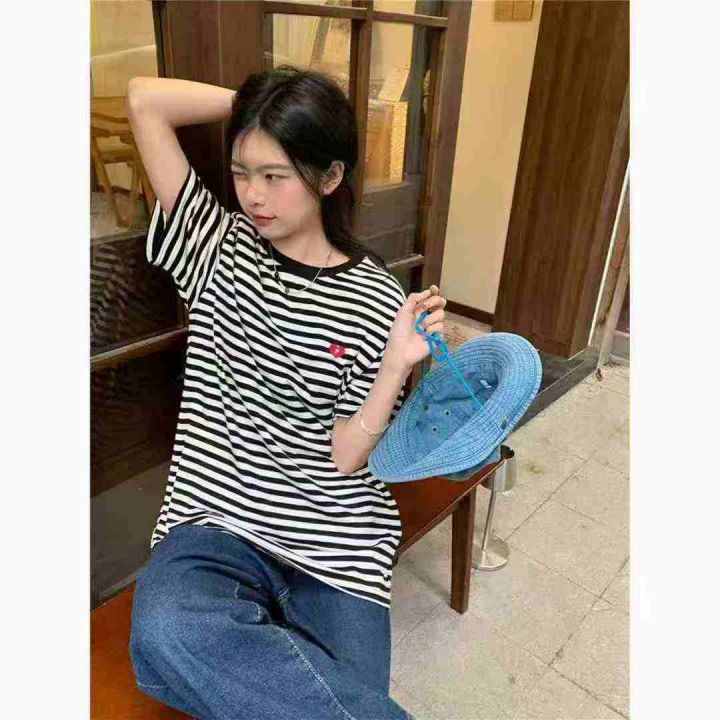 小众设计感撞色条纹爱心刺绣纯棉宽松T恤,[爱心]100件左右,均码,穿80-130斤,万佳档口货,原包装️无瑕疵,[666]实体店品质,分货加一