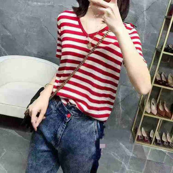 简约V领设计感红条纹宽松百搭T恤,[爱心]105件左右,款号#7017,码数S-2XL,穿80-140斤,[666]工厂原包装瑕疵,(模特图仅供参考),分货加一