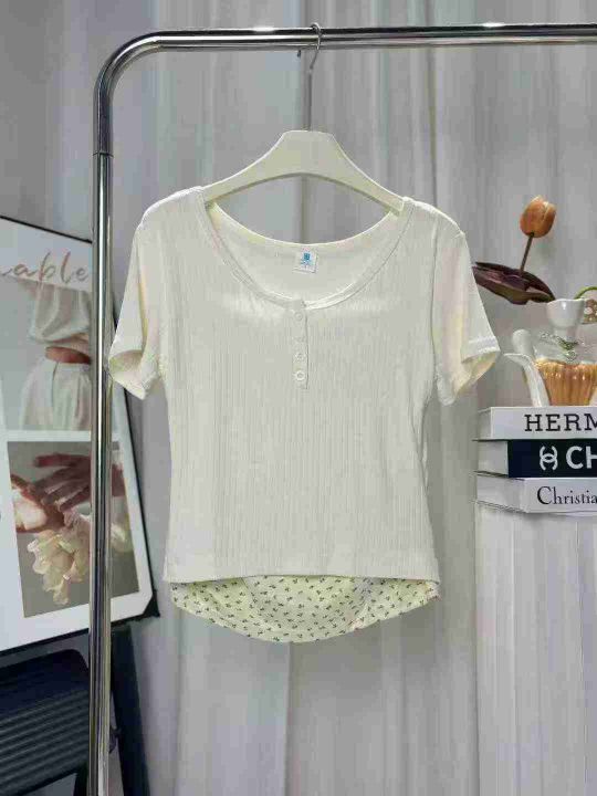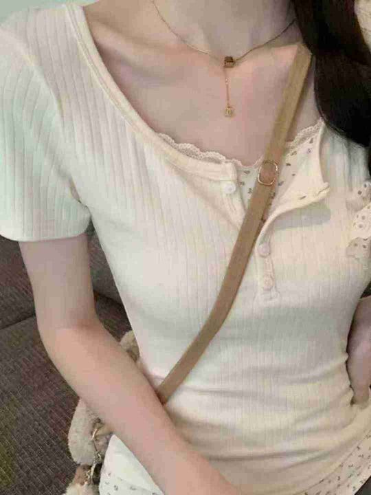 夏季新款蕾丝花边拼接假两件修身显瘦纯欲穿搭短款T恤...