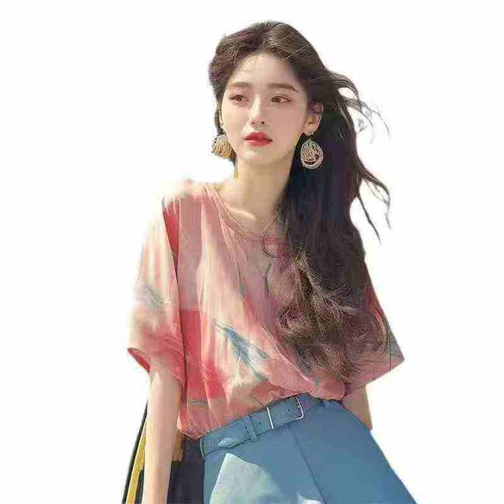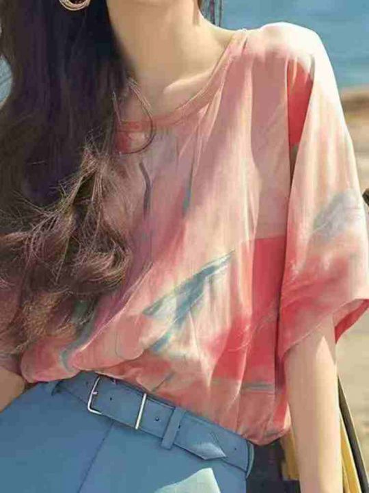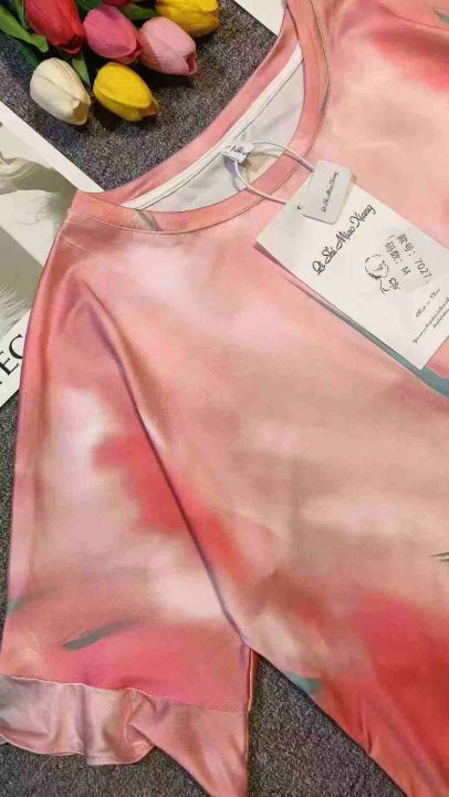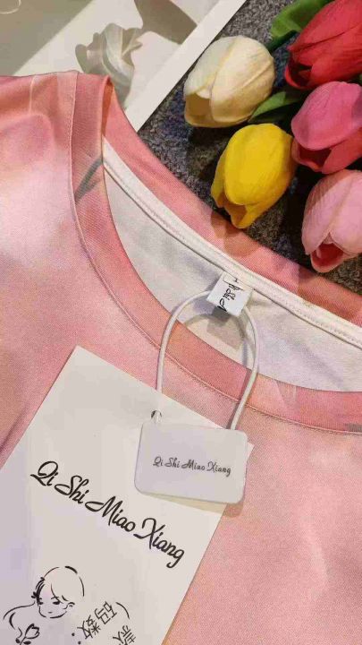上新全清:5.8一件气质独特别致粉色印花显瘦五分袖T恤...