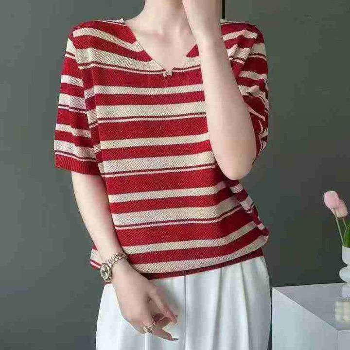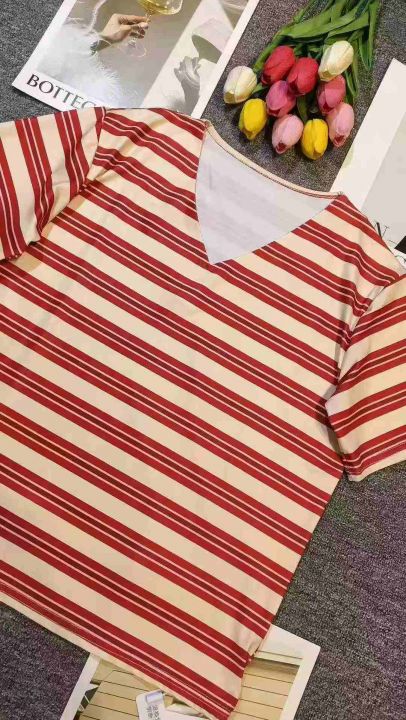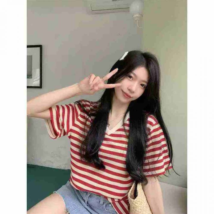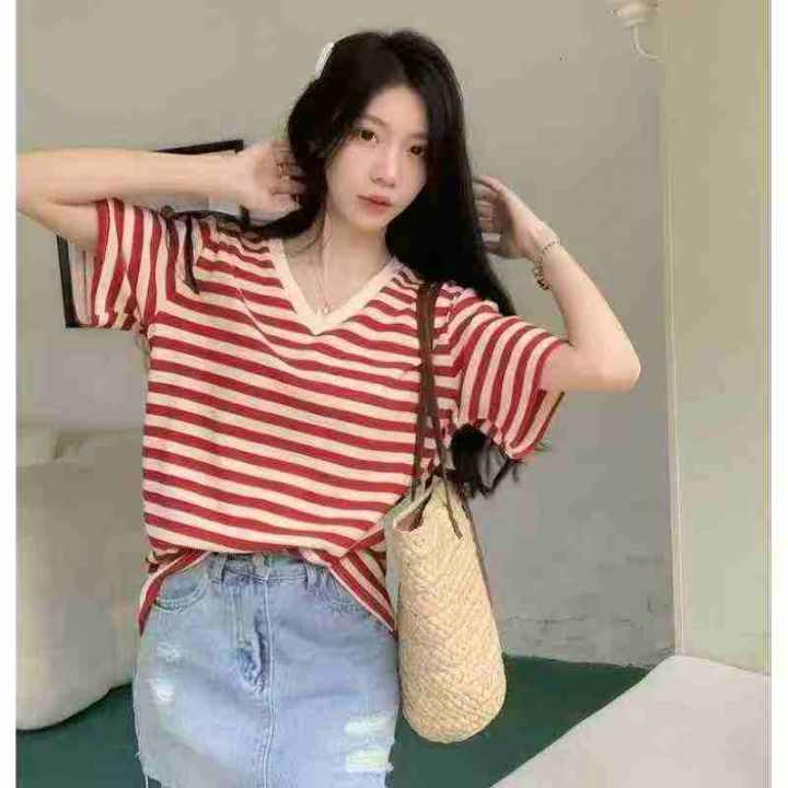 简约V领设计感红条纹宽松百搭T恤,[爱心]105件左右,款号#7017,码数S-2XL,穿80-140斤,[666]工厂原包装瑕疵,(模特图仅供参考),分货加一