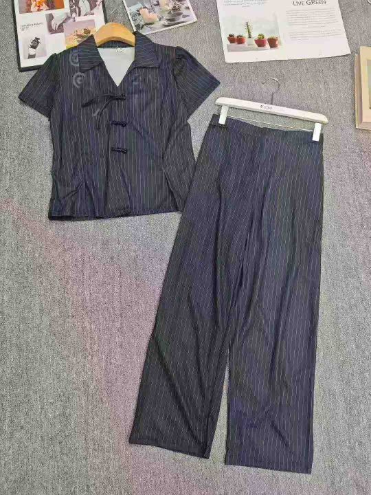 电商仓回收519套气质国风改良新中式条纹翻领短袖长裤套装,码数2-4-6码。面料柔软有弹力,款式新颖,货品干净,有独立包装,分货➕0.5。 货号:1323