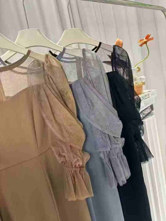 150条左右日单圆领拼接网纱微透喇叭袖收腰显瘦纯色开...