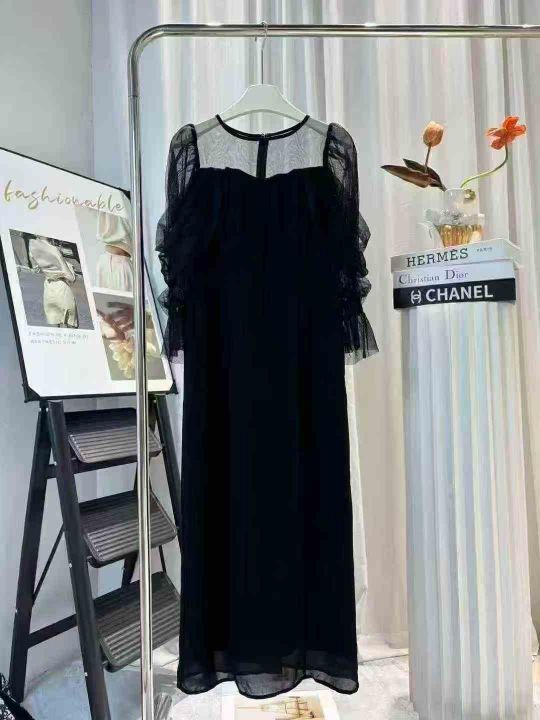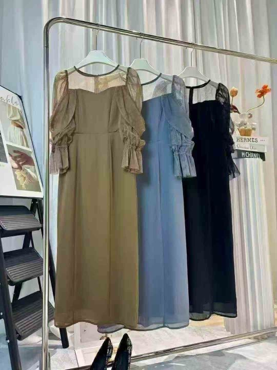 150条左右日单圆领拼接网纱微透喇叭袖收腰显瘦纯色开衩鱼尾连衣裙,质量超好!琉璃网纱微弹力不易勾丝,有内衬,尺码S-L,独立包装!全清17.8。 货号:24862