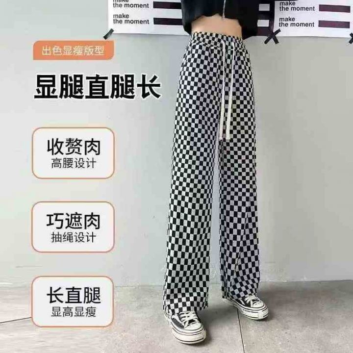 冰丝棋盘格裤子女夏季薄款高腰显瘦垂感休闲阔腿裤 有...