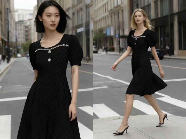 全清19.5法式菱格镶钻方领高腰修身高级时尚连衣裙 数...