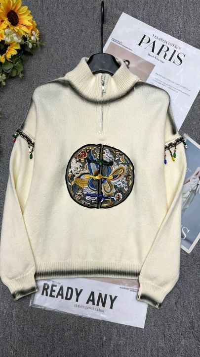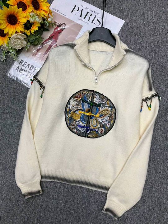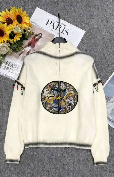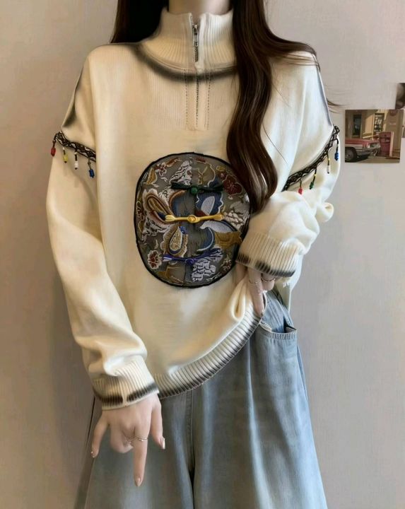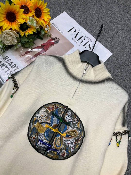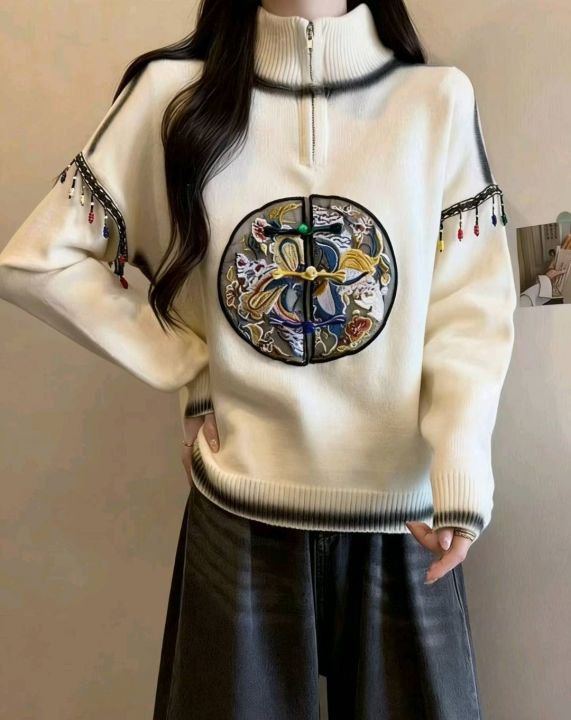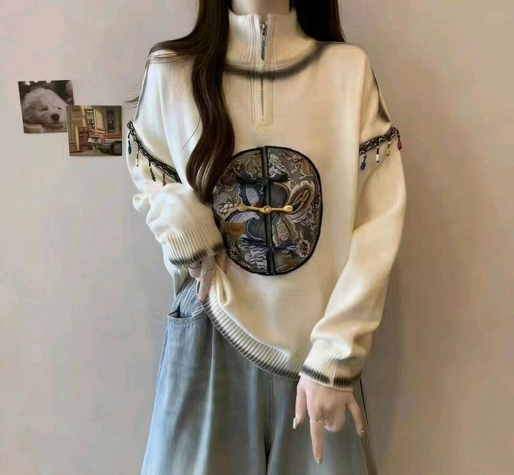 秋冬新款宽松百搭新中式国风盘扣刺绣重工半拉链加厚包芯纱套头毛衣,独立包装,均码面料软糯厚实,121件,全清9.9元超低价秒杀!