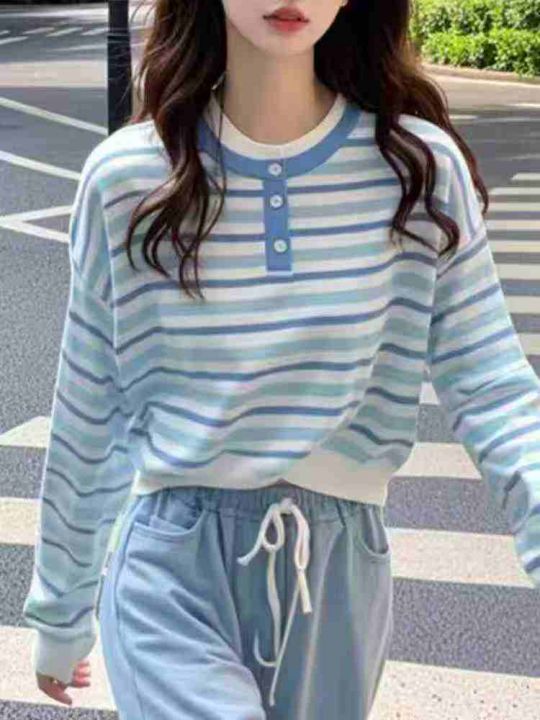 春秋独特别致条纹假两件辣妹宽松纯棉长袖上衣,整款两色,品质好,有独立包...