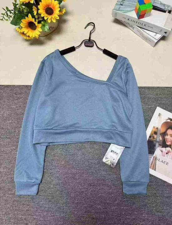 法式高级感露肩斜领蓝色卫衣女秋冬小个子设计感短款露肩长袖上衣,单款单色...