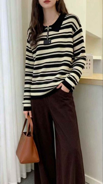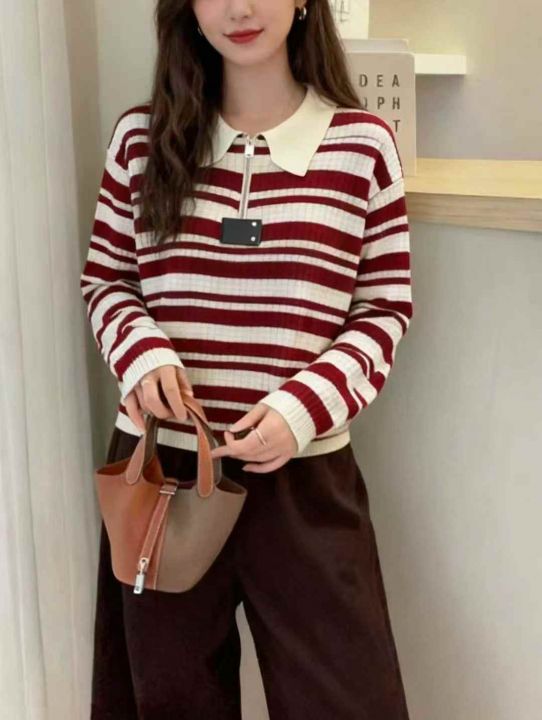 秋冬新款撞色条纹半拉链针织套头毛衣,独立包装,均码...