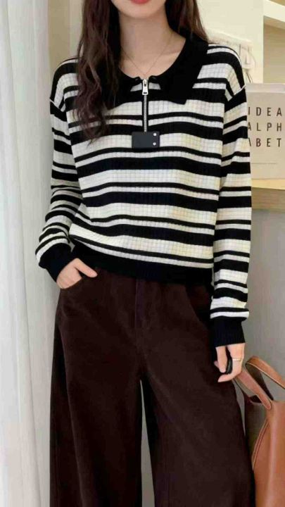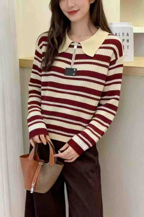 秋冬新款撞色条纹半拉链针织套头毛衣,独立包装,均码...