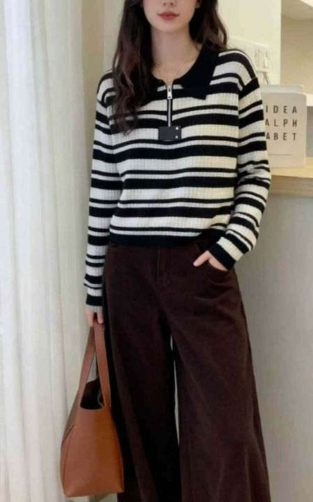 秋冬新款撞色条纹半拉链针织套头毛衣,独立包装,均码...