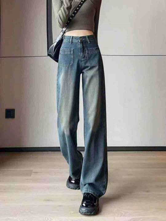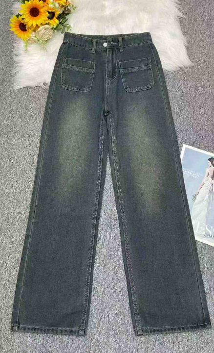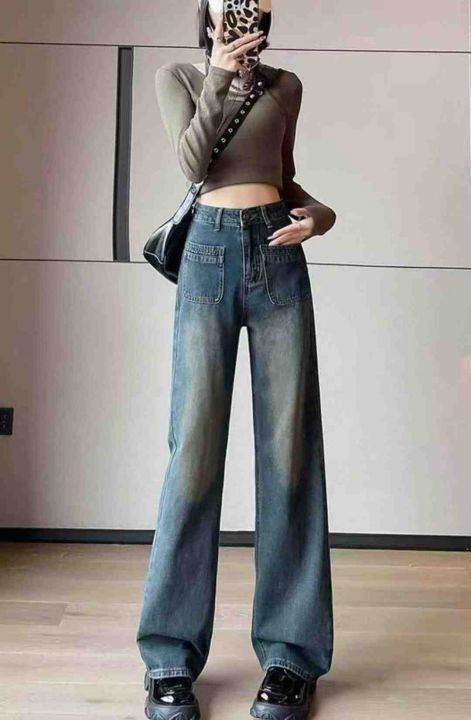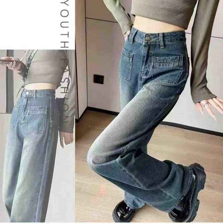 秋冬新款洗水棉网红复古蓝牛仔直筒阔腿裤,独立包装带...