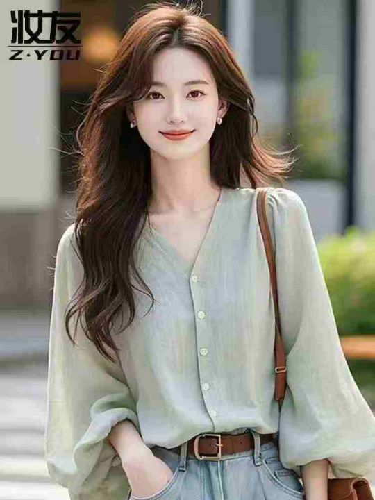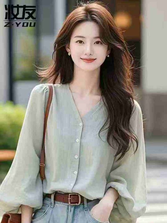 灯笼袖衬衫女高级感轻奢V领独特绝美雪纺小衫上衣,整...