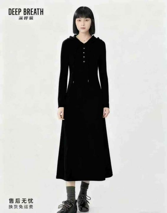 新款法式连帽连衣裙气质修身长袖长裙,高弹力,领口包...