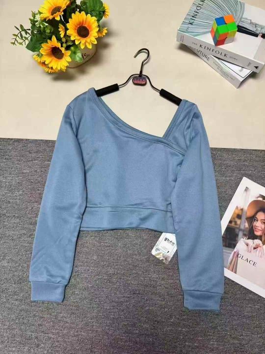 法式高级感露肩斜领蓝色卫衣女秋冬小个子设计感短款露肩长袖上衣,单款单色,品质好,有独立包装带吊牌,码数S-XL,数量280件左右,全清5.8元秒。
