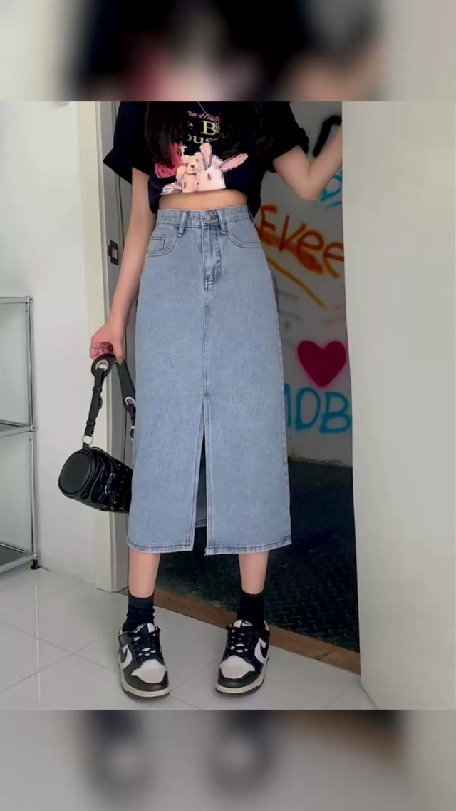 高腰显瘦前开叉牛仔中长款半身裙,单款两色,浅蓝色款多,蓝色少量,数量39...