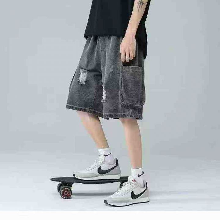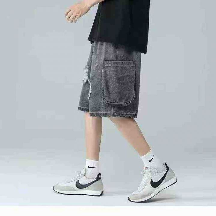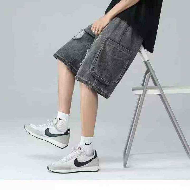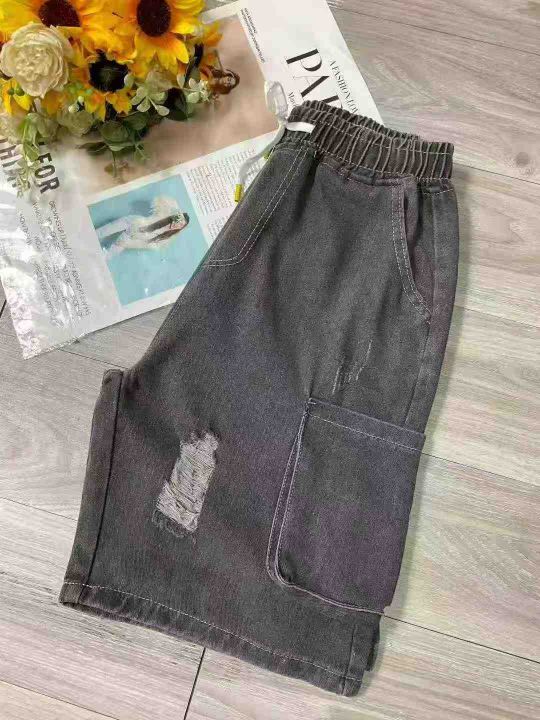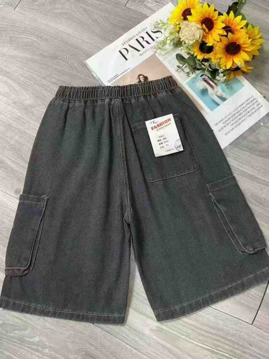 夏季新款松紧腰男士宽松百搭多袋洗水棉牛仔工装短裤,...