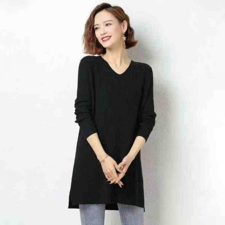 秋冬新款宽松百搭中长款坑条包芯纱2条毛V领套头毛衣,独立包装,均码面料软...