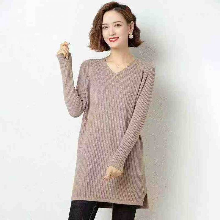 秋冬新款宽松百搭中长款坑条包芯纱2条毛V领套头毛衣,...