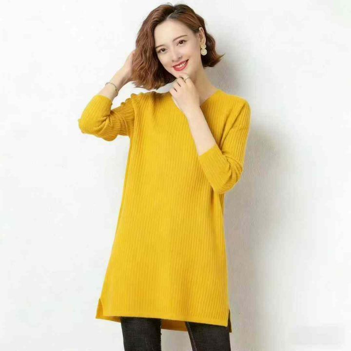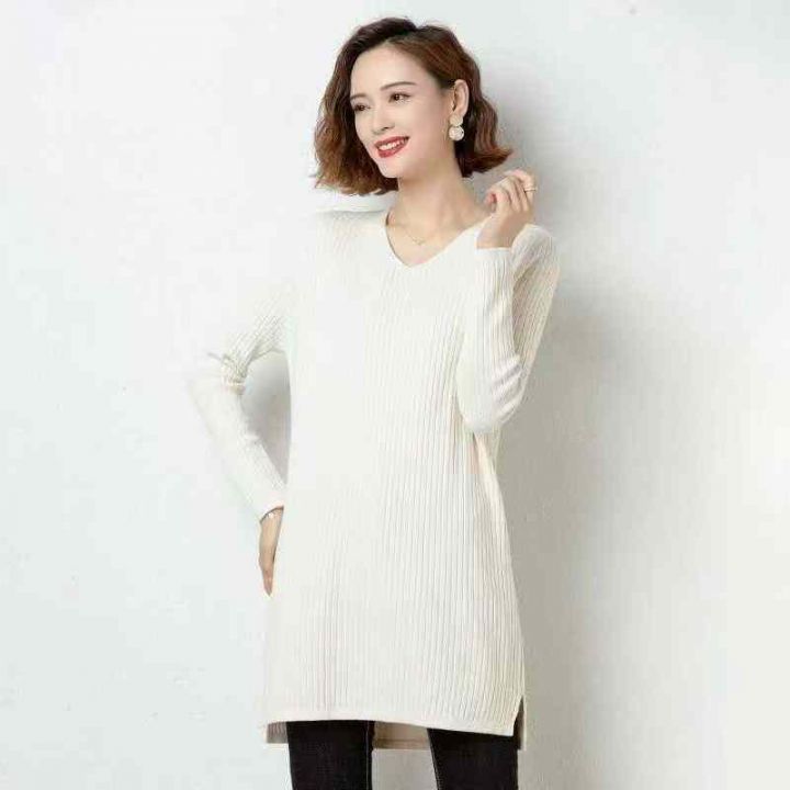 秋冬新款宽松百搭中长款坑条包芯纱2条毛V领套头毛衣,...