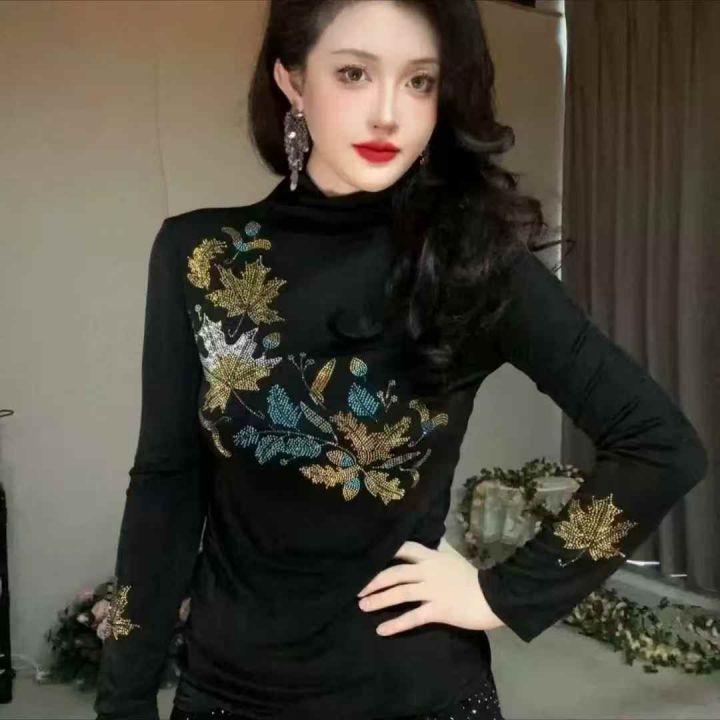 190件左右半高领打底衫时尚烫钻长袖女修身显瘦百搭洋气上衣,面料柔软舒适...