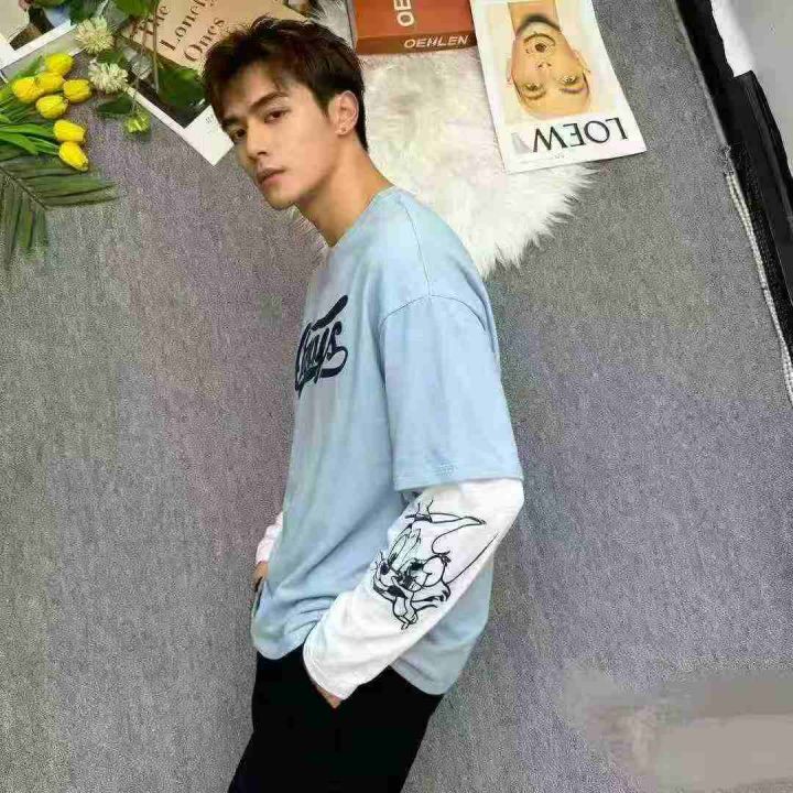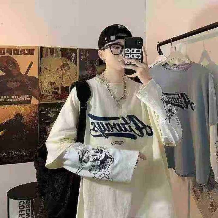 捡漏326件假两件长袖可爱图案t恤男潮牌嘻哈春秋棉T上衣,独立包装,码数M-2XL,分货加1,货号115#70