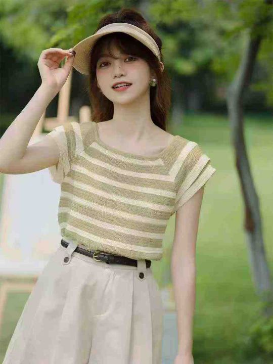 夏季新款小清新甜美复古显瘦针织短袖,独立包装,均码面料柔软舒适弹力大,...