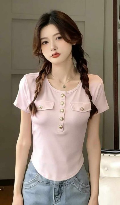 夏季新款时尚气质纯欲不规则弹力修身显瘦短款洋气纽扣圆领短袖t恤,独立包...
