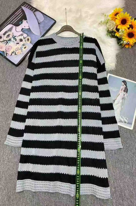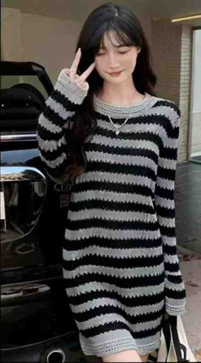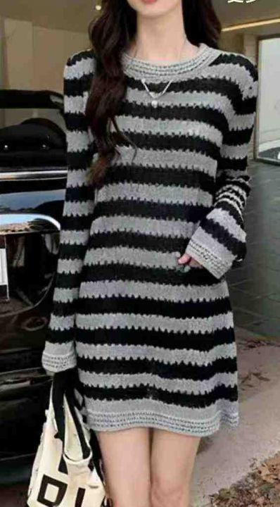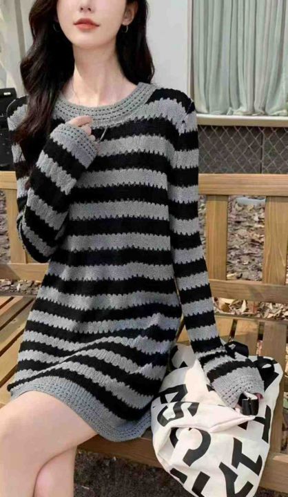 春秋新款韩系宽松百搭撞色条纹针织毛衣裙,独立包装,...