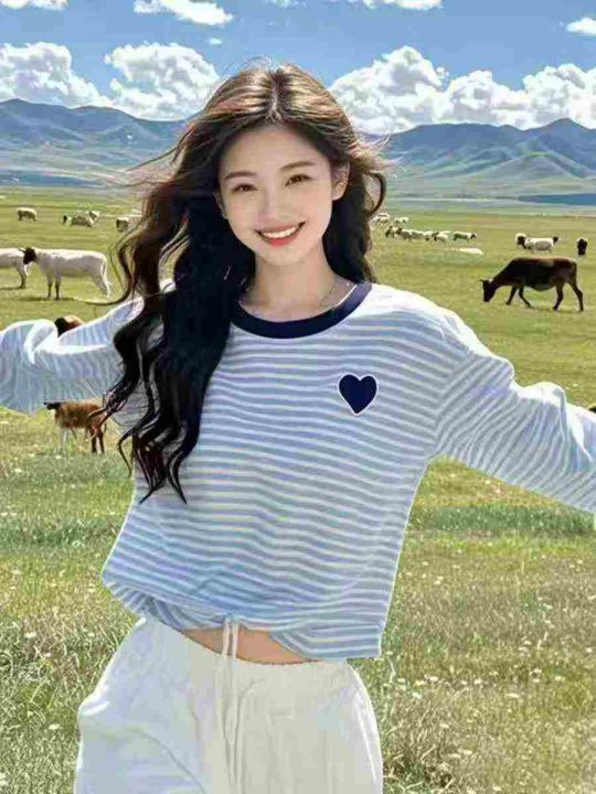 夏季透气撞色条纹长袖T恤女宽松薄款纯棉上衣,图片款...