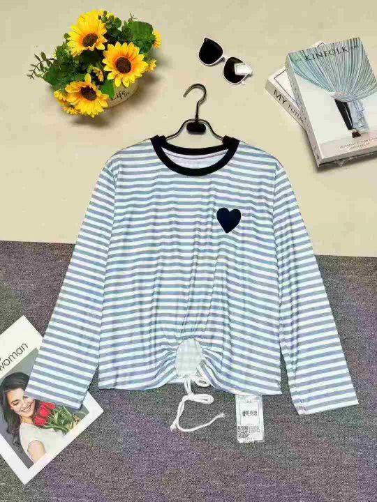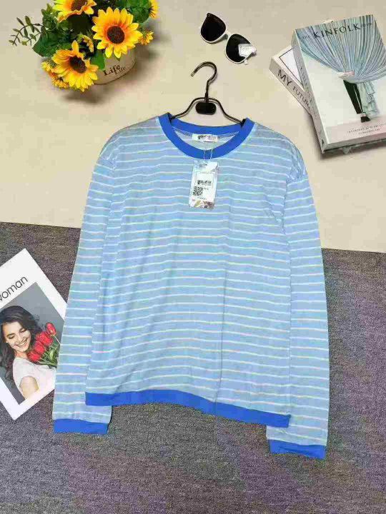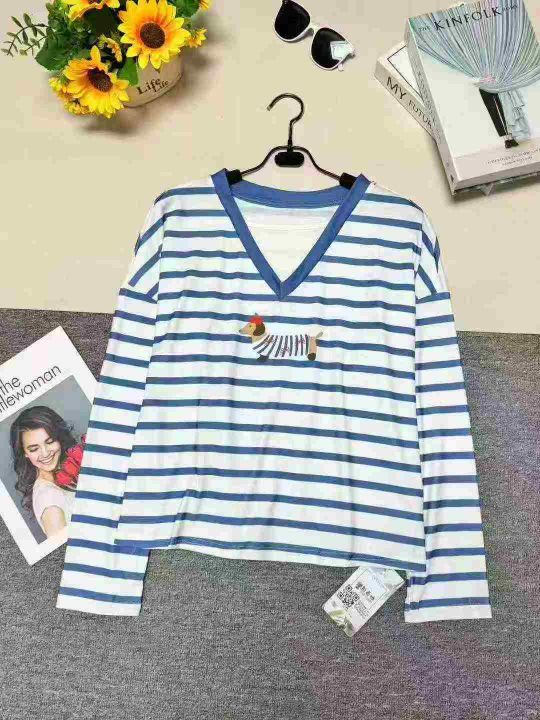 夏季透气撞色条纹长袖T恤女宽松薄款纯棉上衣,图片款,品质好可入实体店,有独立包装带吊牌,码数S-XL,数量700件左右,全清5.8元秒。分货➕1