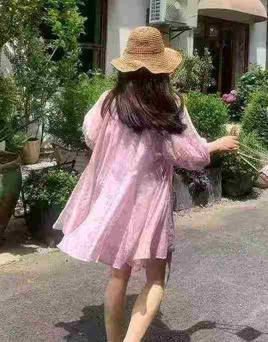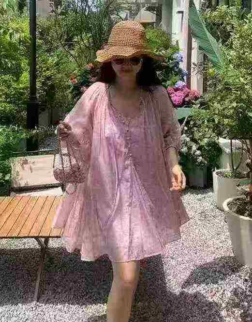 法式复古粉色碎花连衣裙女夏季甜美时尚海边度假宽松收...