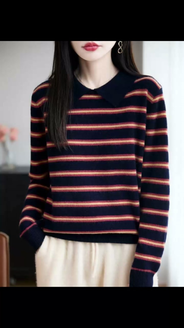 工厂下架一批撞色条纹宽松慵懒风微胖MM针织Polo领套头毛衣,独立包装,均码...