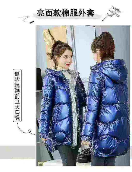 免洗棉服女亮面,韩版棉衣女中长款冬季宽松加厚连帽羽...