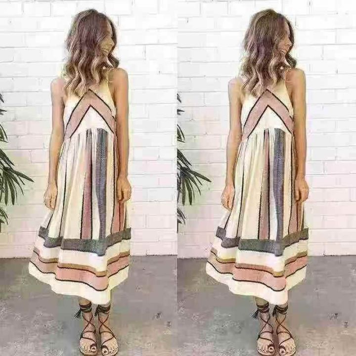 5.8元秒杀[發][發] 时尚印花沙滩休闲百搭中长裙无袖连衣裙,独立包装,码...