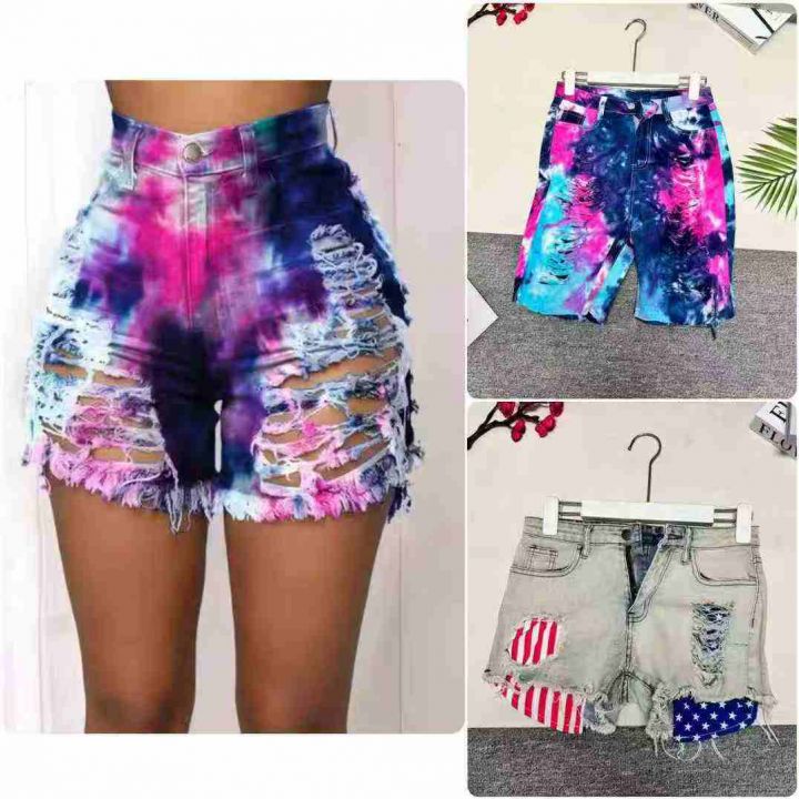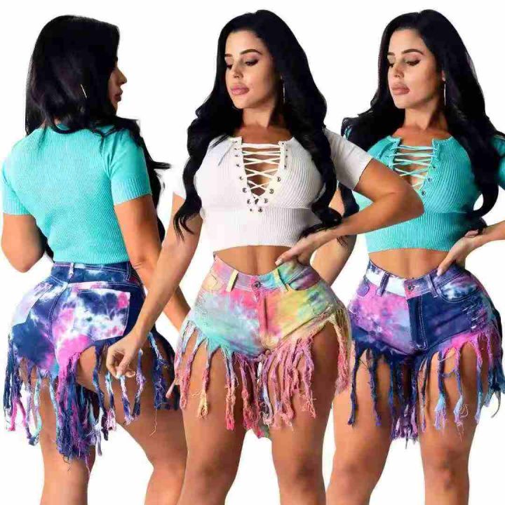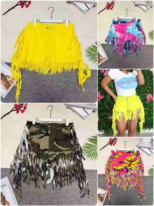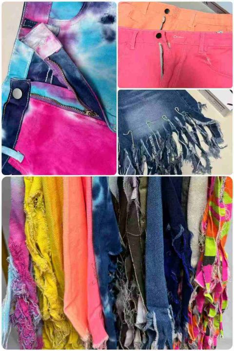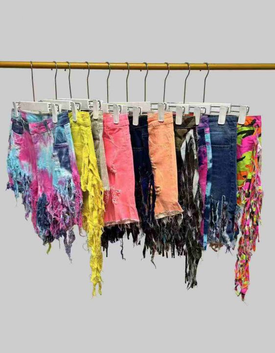 欧美高腰扎染流苏破洞毛边修身直筒短裤,数量200条左右,码数S-2XL,小整款带点杂,品质好,有独立包装。