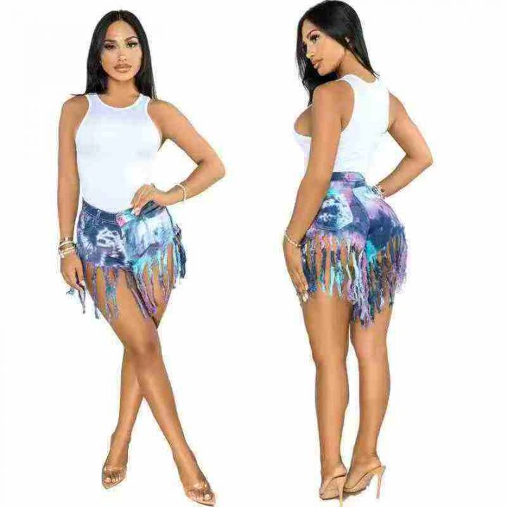 6.8清欧美高腰扎染流苏破洞毛边修身直筒短裤,数量200...