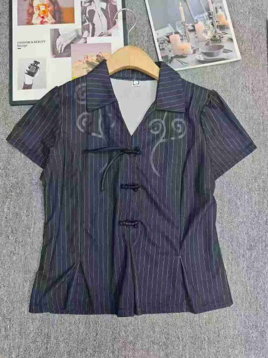 7.8清电商仓回收519套气质国风改良新中式条纹翻领短袖...