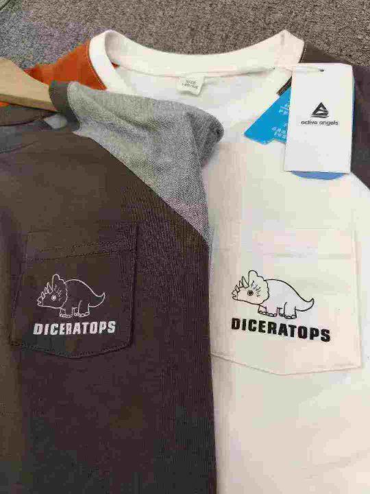 品牌高品质插肩拼色童装T恤短袖 数量1500件左右 尺码110--160 整款两个色 胸前口袋 后面印花 后领包边 独立包装带吊牌 货品整洁质佳