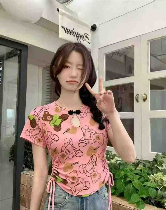 夏季新款新元素抽绳设计款水印弹力棉辣妹短T桖,独立包装,均码面料柔软舒...