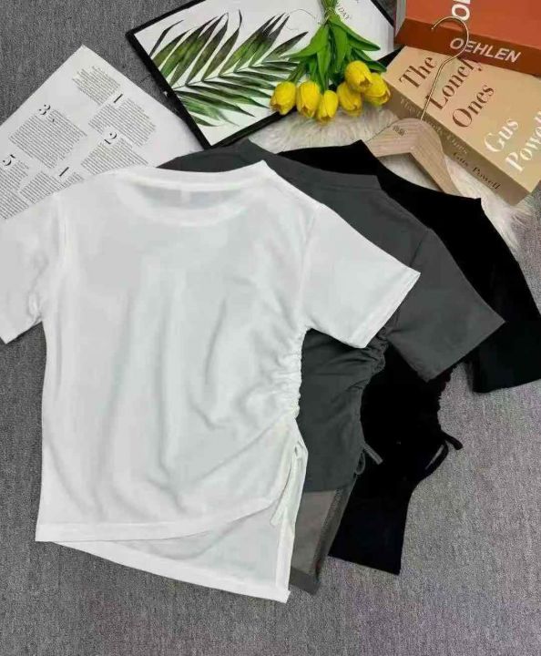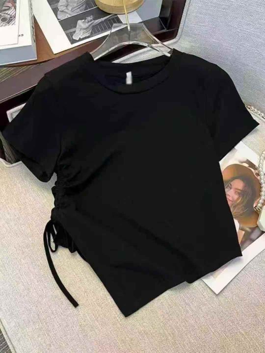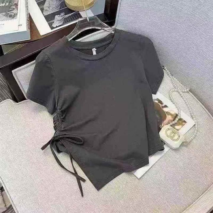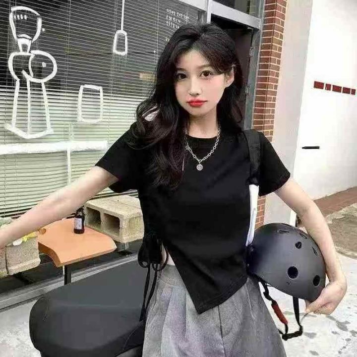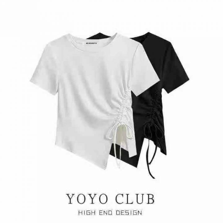 设计感小众不规则短袖抽绳短款百搭辣妹开叉纯色上衣,独立包装,码数1-3码,数量573件,货号0914#50