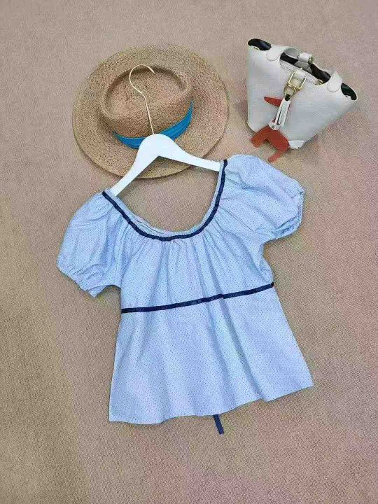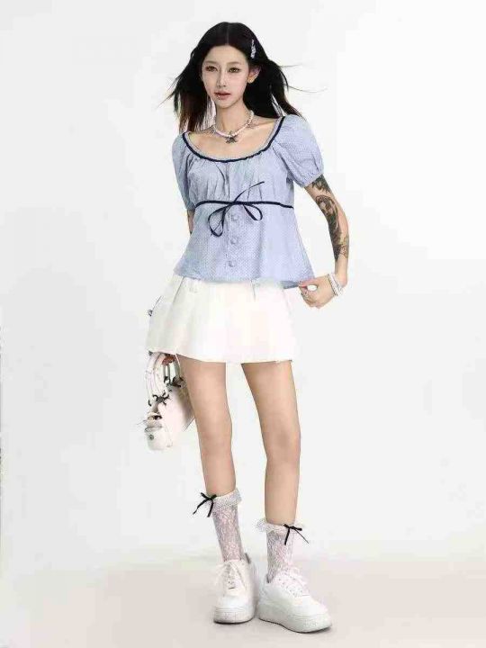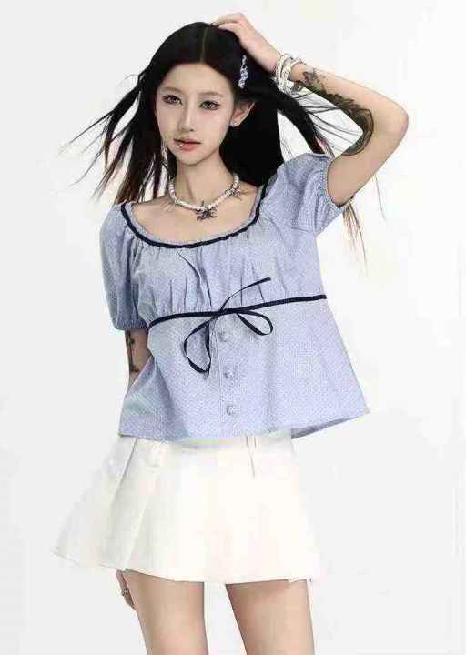 [月亮]:甜美温柔风波点撞色辣妹衬衫上衣