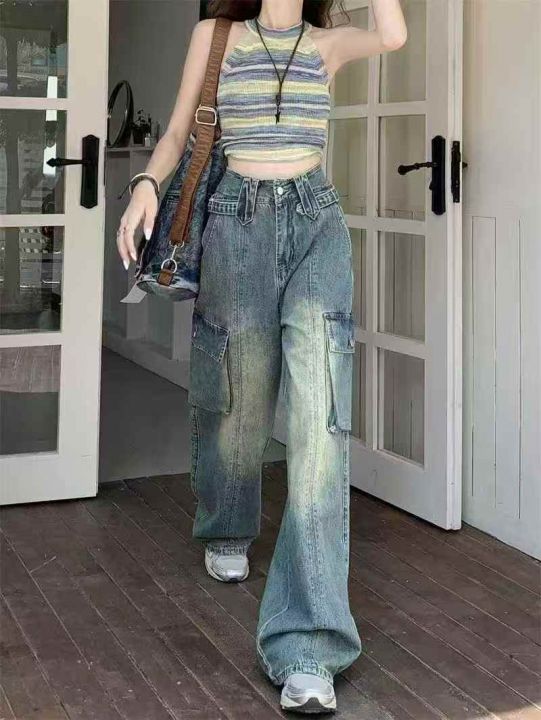美式复古工装直筒牛仔裤女秋季宽松高腰显瘦水洗阔腿裤...