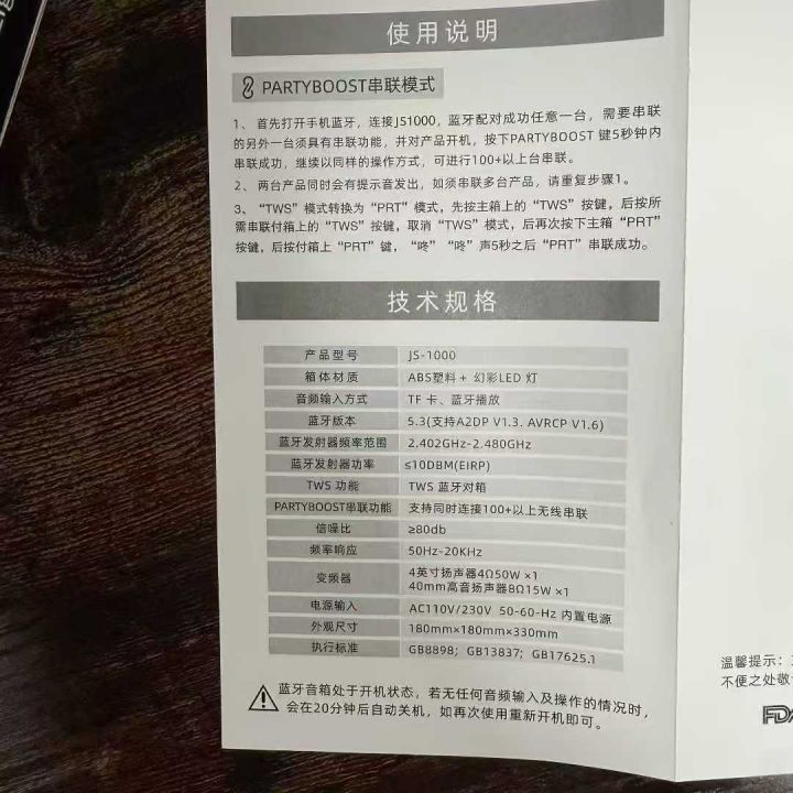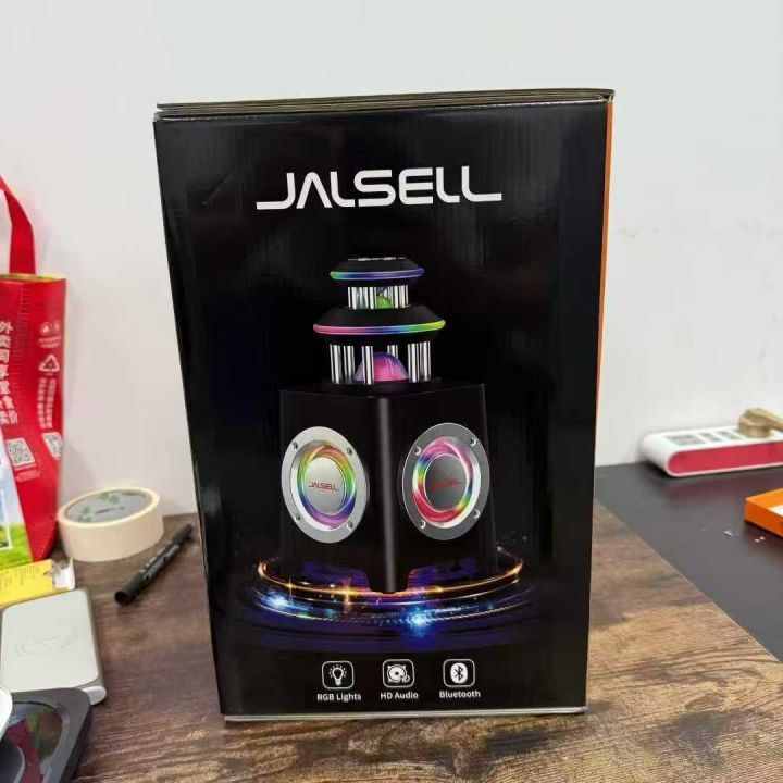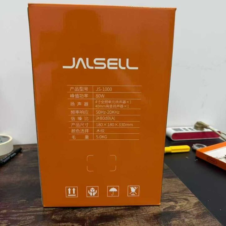 JALSELL JS-1000蓝牙音箱,木纹色,带遥控器,支持TF卡播放和蓝牙5.3连接RGB炫彩灯效,音质清晰,80W大功率,4寸全频扬声器+40mm高音单元,支持APE/FLAC/MP3播放,TWS左右声道自动分,全新未拆封,原装包装。