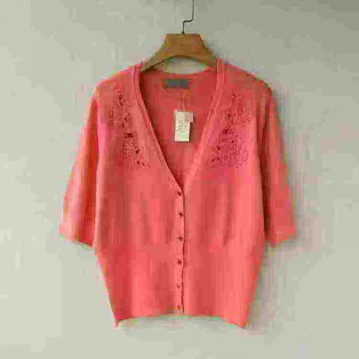 外贸原单春秋女士开衫提花西瓜红半袖中袖V领修身收腰百搭针织衫,高弹力,...