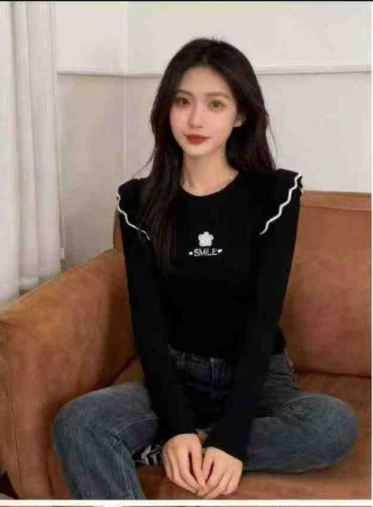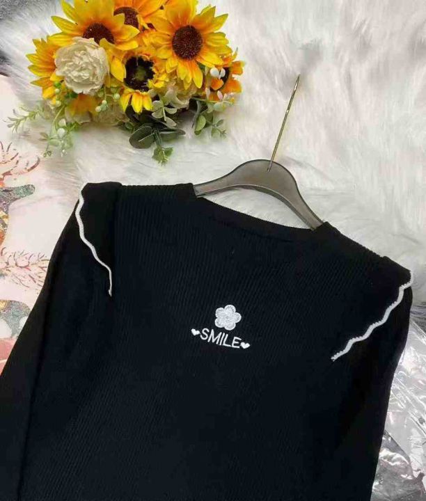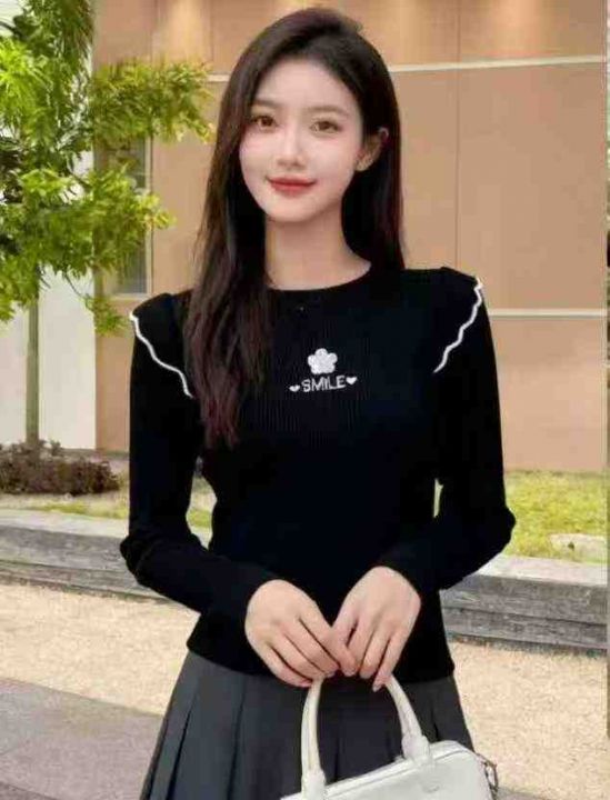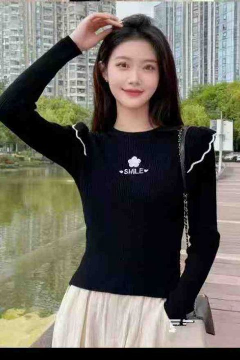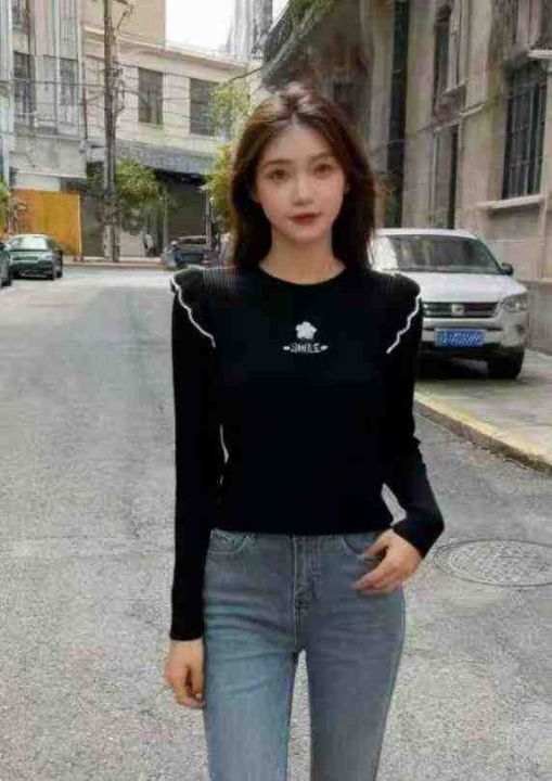 秋冬新款复古港味荷叶边弹力修身刺绣套头毛衣,独立包...