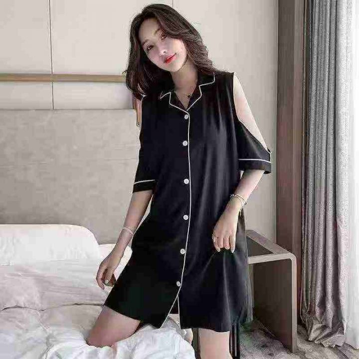 ① 网红冰丝性感露肩韩版宽松家居睡裙!独立包装,整...