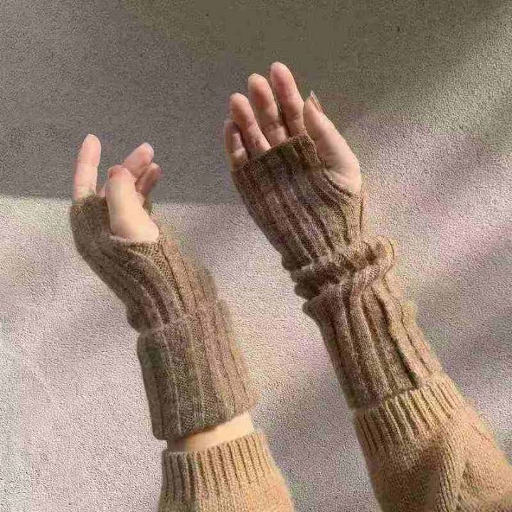 高颜值秋冬户外骑行保暖漏指长手套可爱百搭半指针织手...